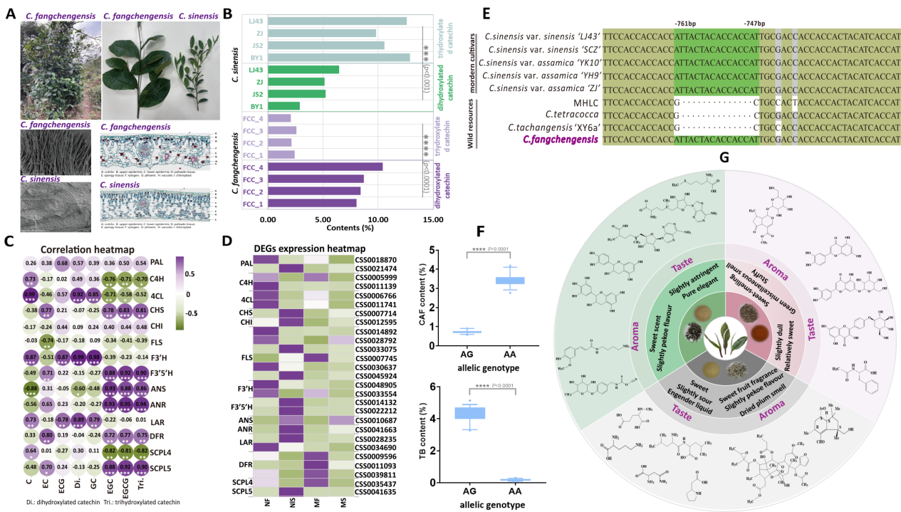 The study found that C. fangchengensis exhibits unique characteristics in terms of morphology and biochemical composition. Morphologically, it is a small arbor with extra-large leaves, densely covered with trichomes on young branches, abaxial leaf surfaces, and calyx. Biochemically, it differs markedlt from cultivated tea plants: its catechin composition is dominated by dihydroxy-catechins, with simple catechins (C) reaching a high of 5.68% and ester-type catechins (EGCG) below 1%. In terms of alkaloids, it contains a relatively high level of theobromine (>4.0%) and a low level of caffeine (<0.5%). Metabolomic and transcriptomic analyses revealed that the high expression of F3'H and the low expression of F3'5'H jointly contribute to the accumulation of dihydroxy-catechins in C. fangchengensis. However, there was no common 14 bp deletion in the promoter region of F3'5'H in C. fangchengensis, which was often found in other wild tea plants, indicating that its expression regulation mechanism differs from known ones. A novel missense mutation was also identified in the caffeine synthase gene TCS1 of C. fangchengensis, which was significantly associated with its high theobromine and low caffeine contents.