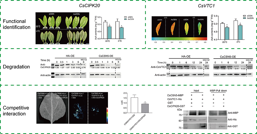 Ca2+作为重要的第二信使,在植物中参与许多生物学过程。团队前期研究发现:钙离子信号途径在茶树响应低温胁迫中发挥重要作用。其中,钙调磷酸酶B类似蛋白互作蛋白激酶(CIPK)是钙离子信号途径的重要元件,广泛参与植物的生长发育和对多种环境刺激的响应。该研究发现茶树CsCIPK20的表达受冬季低温与短时低温处理的显著诱导。基因瞬时抑制试验表明,CsCIPK20与抗坏血酸(AsA)合成酶—GDP-甘露糖焦磷酸化酶1(CsVTC1)均正向调节茶树新梢的抗寒性。蛋白互作与蛋白降解试验表明,CsCIPK20、CsVTC1均可与E3连接酶活性调节子5(CsCSN5)互作,同时,CsCSN5分别介导两者的蛋白降解。进一步研究发现,CsCIPK20通过与CsVTC1竞争性结合CsCSN5,抑制CsCSN5对CsVTC1蛋白的降解,提高低温下AsA水平,进而增强茶树在低温下的抗氧化能力与耐受性。该研究为耐寒茶树新品种的选育提供了新的基因资源和理论依据。