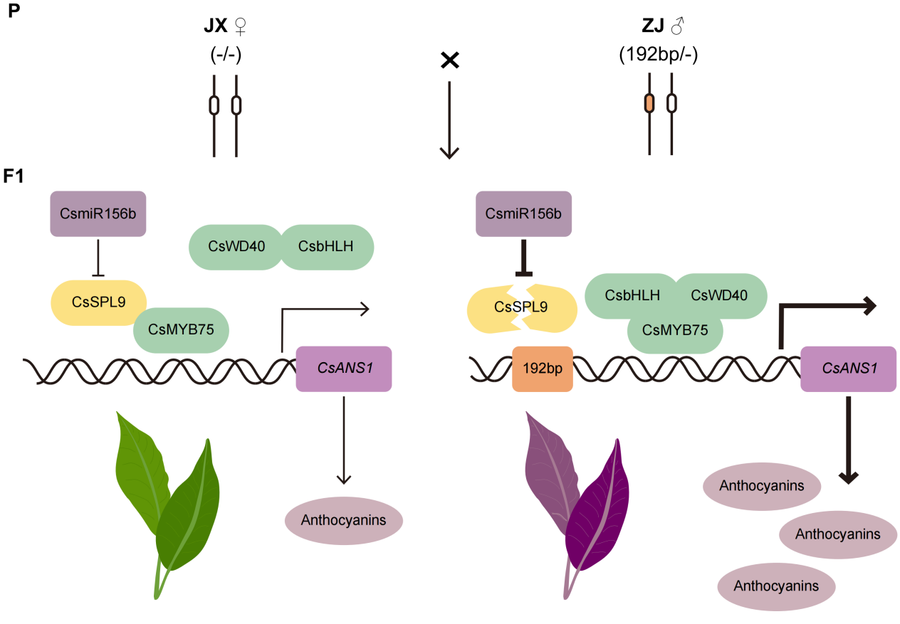 通过对F1杂交群体的代谢组和转录组联合分析发现,CsANS1的表达量与花青素含量呈极显著正相关,是驱动该杂交群体花青素变异的核心基因。虽然CsANS1编码区存在两个非同义突变,但在拟南芥中的异源过表达实验表明,不同等位基因的功能无显著差异。关键在于CsANS1启动子区:在高花青素品种的CsANS1启动子中,均保守存在一个192 bp的插入片段,而在低花青素品种中该片段完全缺失,且该插入片段与杂交群体的高花青素表型完全连锁。含有此192 bp插入的启动子活性显著提升,且该片段的存在显著增强了转录因子CsMYB75对CsANS1的转录激活能力。