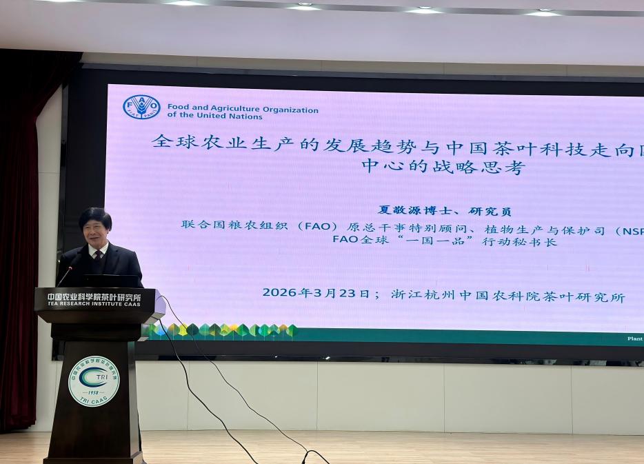 3月23日,联合国粮农组织(FAO)原总干事特别顾问、植物生产与保护司(NSP)司长、FAO全球“一国一品”行动秘书长夏敬源研究员应邀来所访问交流,并作《全球农业生产的发展趋势与中国茶叶科技走向国际舞台中心的战略思考》报告。副所长姚明哲参加并主持会议。