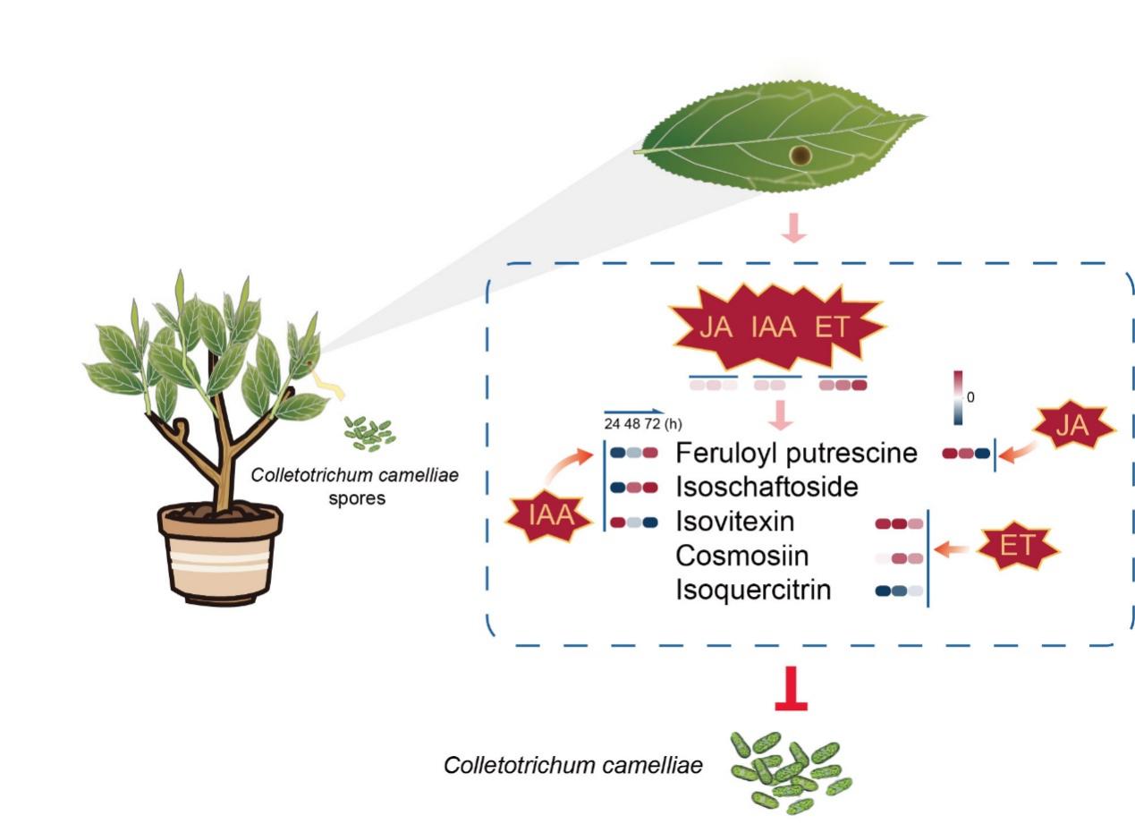 研究人员通过接种实验首次获得了直接的表型证据,发现茶炭疽菌侵染不仅能抑制病斑的局部扩展,诱导信号还能在枝条内传递,激发相邻叶片的系统性抗病性。研究揭示,茶树抵御该半活体真菌并非由水杨酸通路主导,而是依赖茉莉酸、乙烯以及植物生长素介导的信号通路。进一步研究锁定了5种关键的次生代谢物(异槲皮苷、大波斯菊苷、异牡荆素、异夏佛塔苷和阿魏酰腐胺),病原菌侵染显著诱导了这些物质的积累,且体外实验证实它们对茶炭疽菌具有明确的抑制效果。此外,通过外用茉莉酸甲酯、植物生长素或乙烯前体处理茶树,均能有效促进上述抗病代谢物的积累,并显著减小随后接种的病斑直径。