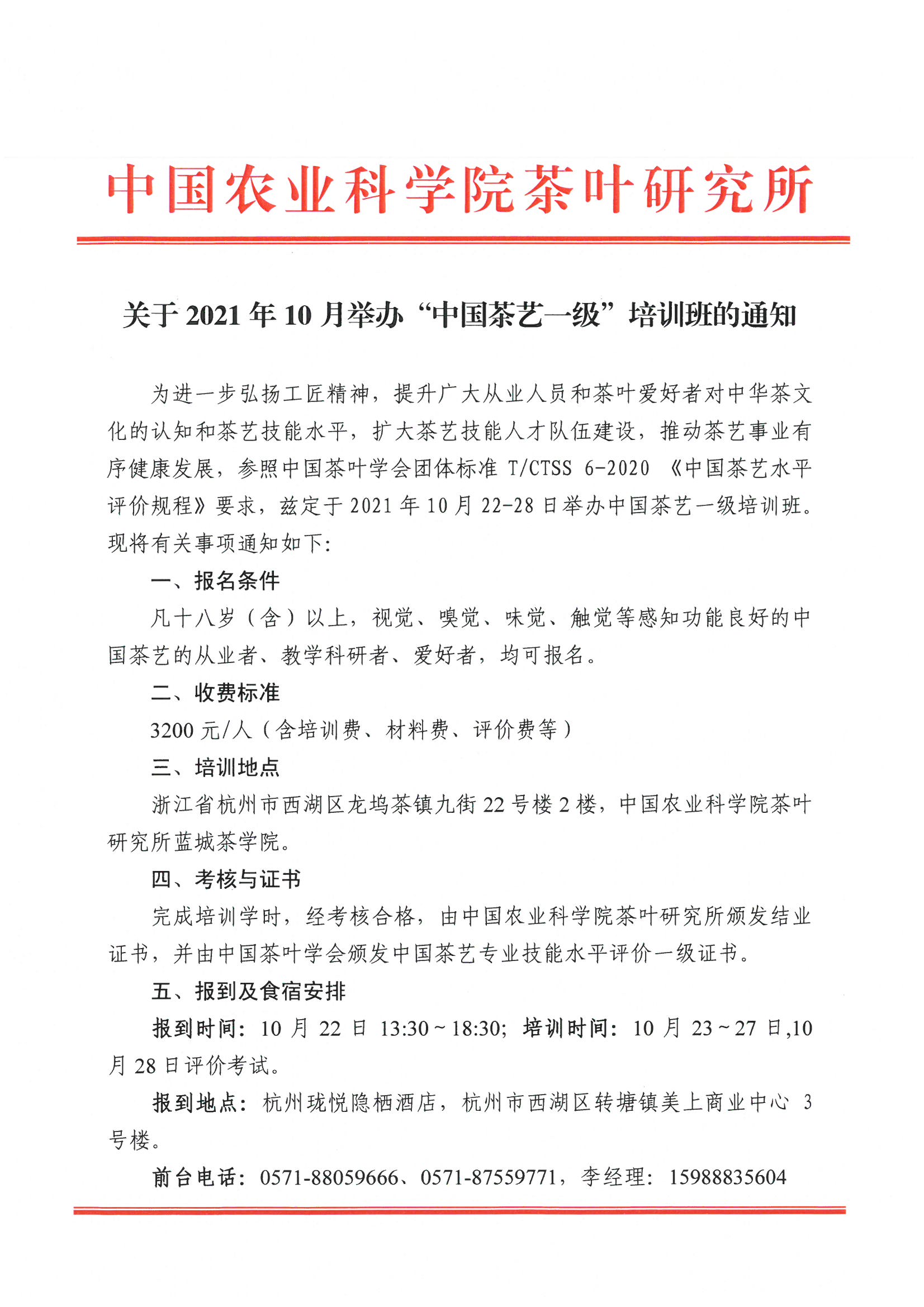中国农业科学院茶叶研究所关于2021年10月22-28日举办中国茶艺一级培训班的通知